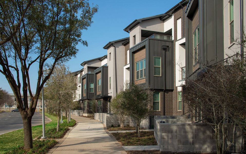 A continuation of the Vitruvian Park development, this project delivers luxurious townhomes while providing convenient access to the city. Metallic boxes are nested within larger white stucco masses that are supported by a dark masonry base. Lush landscape accents compliment the smooth concrete block walls in the yards and create a buffer between the urban and private boundaries of the site.